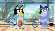 Onkel Stripe und Bandit spielen Squash mit der Hilfe von Bingo und Bluey.