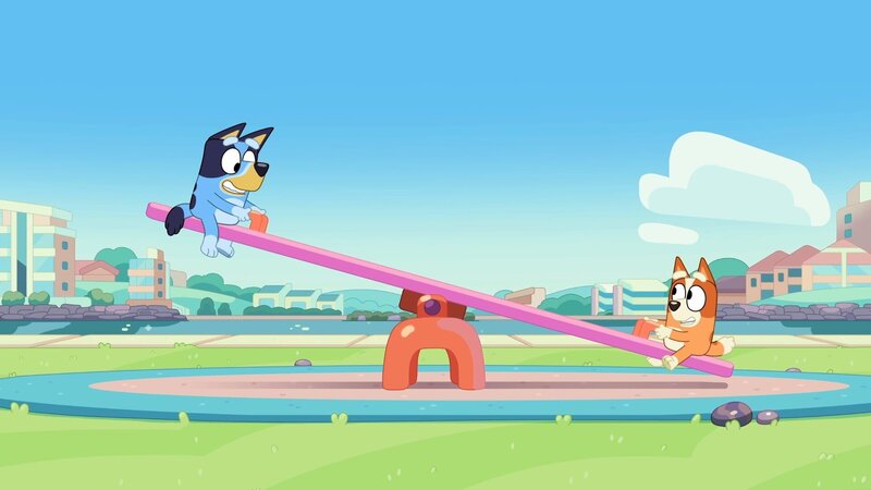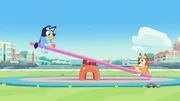 Dad hat sich einfach auf das eine Ende der Wippe gesetzt. Also trommeln Bluey und Bingo den ganzen Spielplatz zusammen, um ihn gemeinsam zu verjagen, aber sie brauchen noch einen Freund mehr.