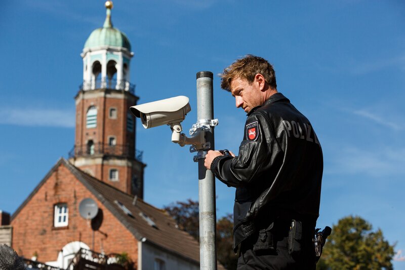 Henk Cassens (Maxim Mehmet) bringt eine Überwachungskamera für das neue Sicherheitskonzept der Polizei Leer an.