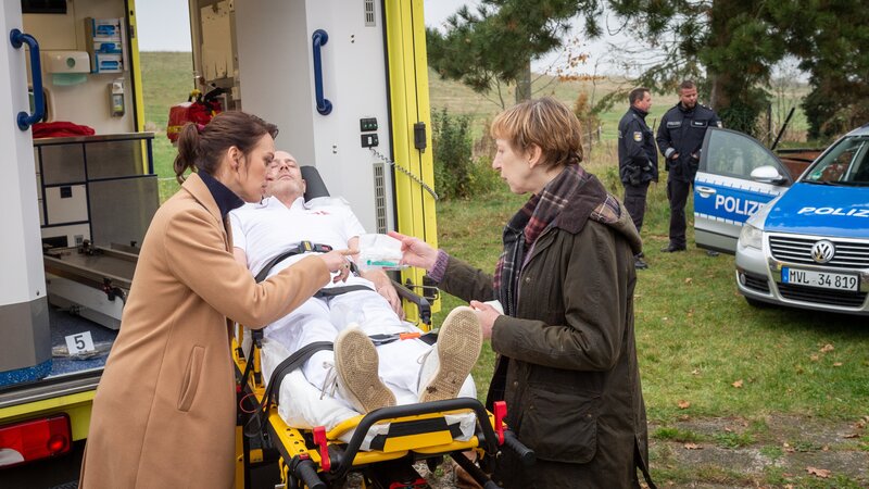 • Ein ungewöhnlicher Fall: Polizeihauptmeister Timmermann (Mathias Junge, M.) und Stine Bergendal (Sisdel Hindhede, l.) werden zu einem Einsatz gerufen. Vor Ort kommen Hilferufe aus dem Rettungswagen. Als die beiden die Tür öffnen, offenbart sich ihnen ein furchtbares Bild. Rettungsassistentin Franziska Wagner (Pinar Erincin, r.) ist gefesselt, ihr Kollege Dr. Christian Pohl ist tot.