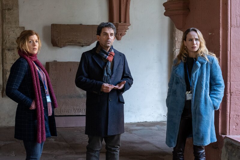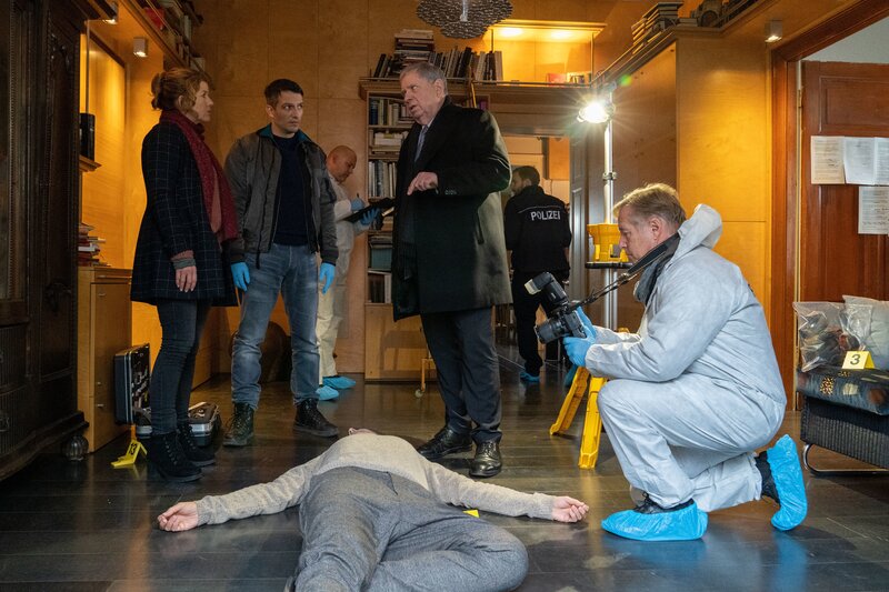 • Oberstaatsanwalt Bernd Reuther (Rainer Hunold, 3.v.r.), Hauptkommissarin Kerstin Klar (Fiona Coors, l.) und Oberkommissar Max Fischer (Max Hemmersdorfer, 2.v.l.) wurden gerufen, weil ein Seminarteilnehmer (Martin Halm, M.) gewaltsam ums Leben gekommen ist.