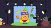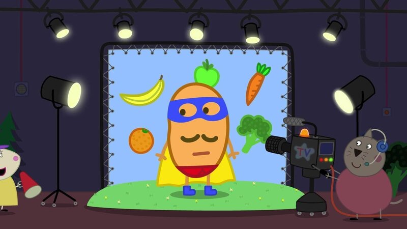 Heute schauen Peppa und Schorsch hinter die Kulissen einer TV-Produktion. Frau Löffel führt die beiden über das Set von Superkartoffels TV-Show.