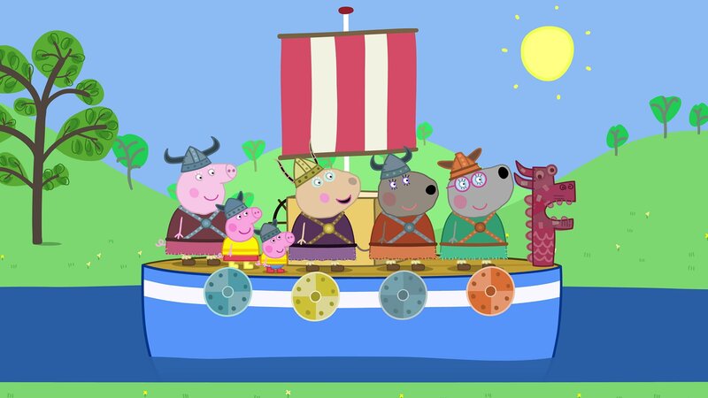 Heute verbringen Peppa und Schorsch (mi.) den Tag mit Oma Wutz und ihren Freundinnen, um Wikinger zu spielen. Sie nutzen Opa Wutz' Boot als Wikingerschiff und stechen in See. Die Wikinger haben viel Spaß auf dem Boot, bis sie bemerken, dass sie ihren Proviant vergessen haben. Auf der Suche nach Essen machen sie einen Landgang und treffen letzten Endes auf Frau Mümmels Imbissstand.