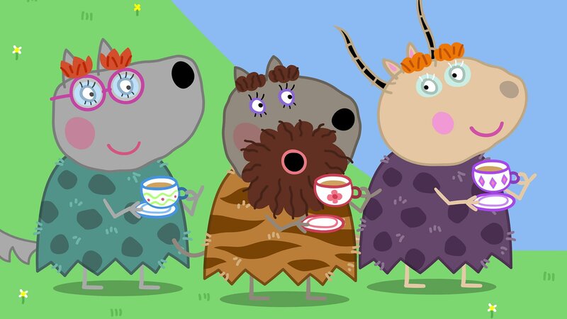 • Oma Wutz (re.) und ihre Freundinnen (li.) tun heute so, als ob sie in der Steinzeit leben. Peppa (2.v.re.) und Schorsch (3.v.re.) schließen sich prompt an.