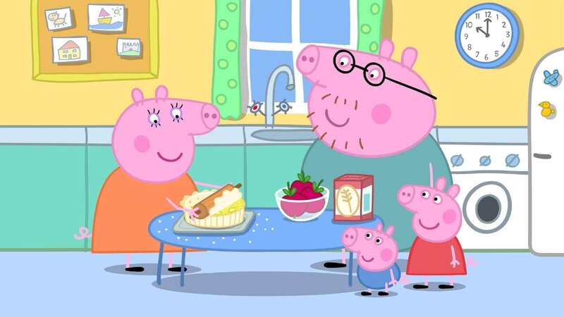 Mama Wutz (li.) backt heute einen Apfelkuchen. Während Familie Wutz wartet, bis er fertig ist, spielen Papa Wutz (hi.re.), Peppa (vo.re.) und Schorsch (mi.) ein Suchspiel.