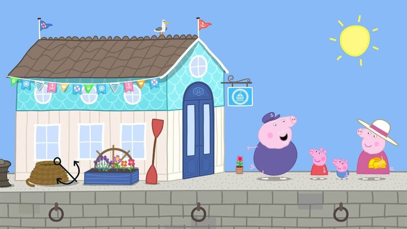Peppa (li.) und Schorsch (vo.re) verbringen den Tag mit Oma (hi.re.) und Opa Wutz beim Segeln. Als sie einen Stop beim Clubhaus einlegen, stoßen sie dort auf eine eingestaubte Musikbox.