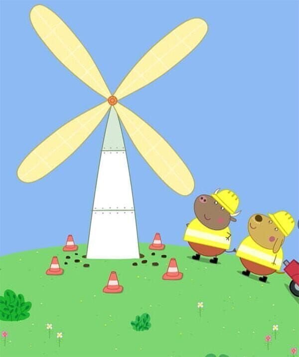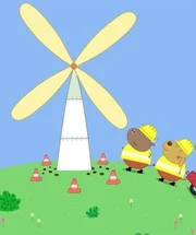Peppa und ihre Freunde sind in der Spielgruppe, während Herr Bulle auf einem nahegelegenen Hügel fleißig arbeitet und etwas baut. Alle Kinder versuchen zu erraten, um was es sich da wohl handeln mag. Es ist ein Windrad!