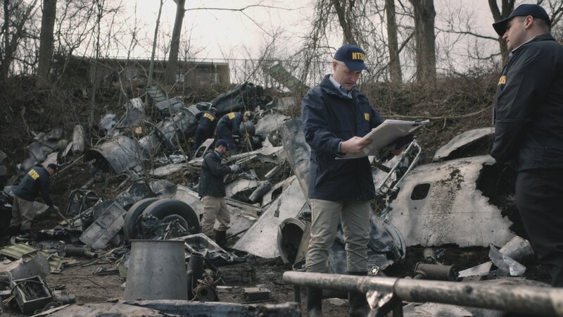 REENACTMENT - The Lead NTSB Investigator (played by Brendan Wall) reviews crucial documents at the crash site of Execuflight 1526. (Cineflix/James Griffith)