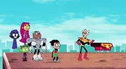 v.li.: Raven, Starfire, Beast Boy, Cyborg, Robin, Brother Blood