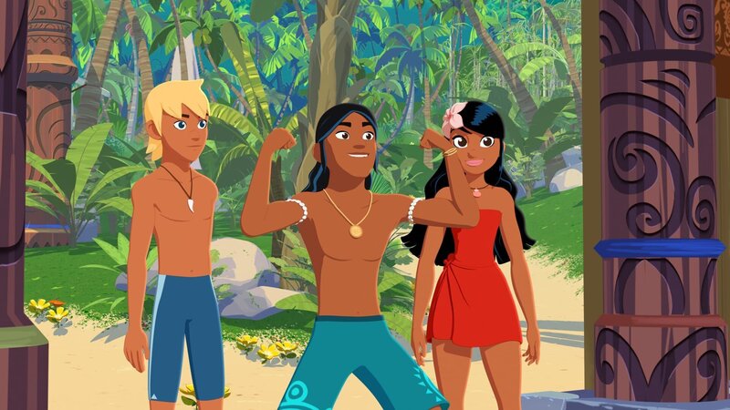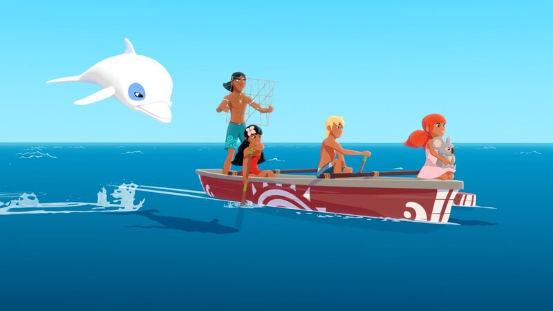 • Auru (v.l.), Timeti, Yann, Marina und Koala Raoul sind zusammen mit Zoom auf dem Meer unterwegs, um Fische zu fangen. Sie wollen das Wettfischen gegen die Nachbarinsel gewinnen.