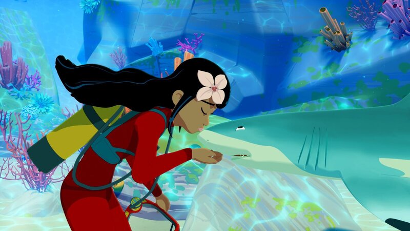 • Timeti (l.), Yann (M.) und Auru (r.) eilen zusammen mit Zoom dem in seinem U-Boot in Not geratenen Onkel Patrick zu Hilfe. Leider taucht in diesem Moment auch der nicht ungefährliche Hai Rahi auf.