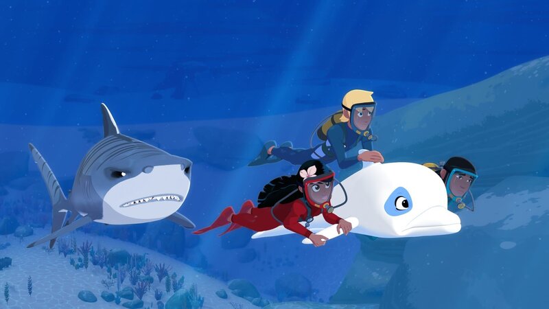 Timeti (l.), Yann (M.) und Auru (r.) eilen zusammen mit Zoom dem in seinem U-Boot in Not geratenen Onkel Patrick zu Hilfe. Leider taucht in diesem Moment auch der nicht ungefährliche Hai Rahi auf.