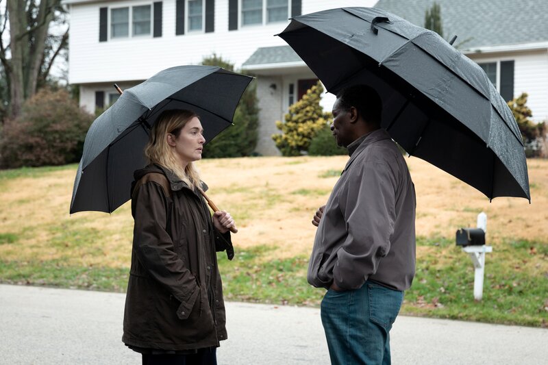 l-r: Mare Sheehan (Kate Winslet), Detective Colin Zabel (Evan Peters), Deacon Mark Burton (James McArdle)