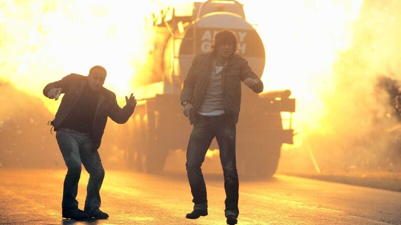 Semir (Erdogan Atalay, l.) und Ben (Tom Beck) haben die Gangster in einem Tank-LKW verfolgt. Als dieser plötzlich explodiert, können sie sich in letzter Sekunde durch einen Sprung auf die Autobahn retten...