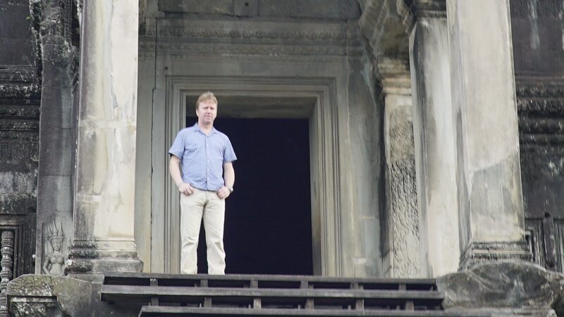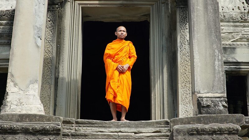 A monk stands in the temple of Angkor Wat, Cambodia, as seen on Travel Channel's Legendary Locations.