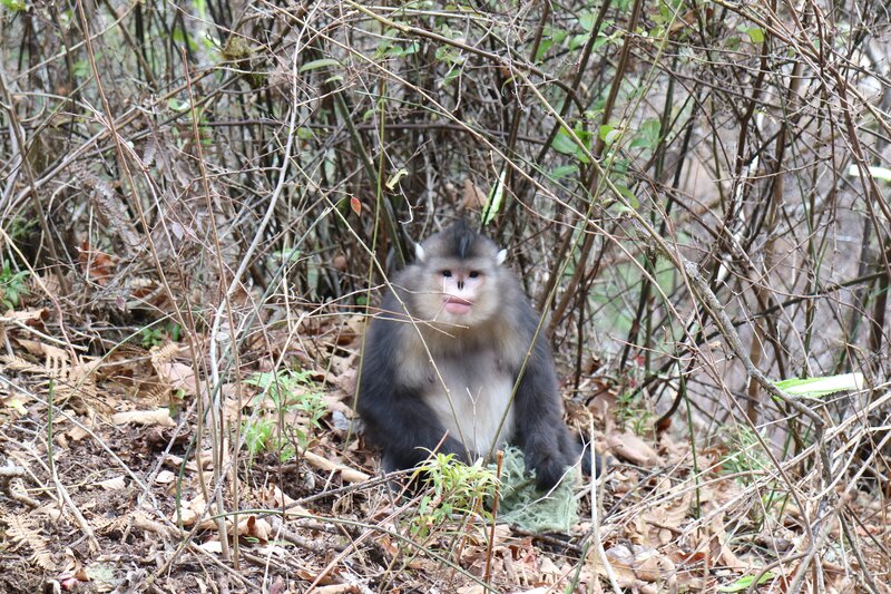 • Baima Snow Mountain Nature Reserve, Yunnan - Stupsnasenaffe aus Yunnan, der mit seiner Lieblingsspeise Flechten in der Hand auf dem Boden sitzt.