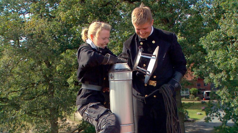Schornsteinfeger-Gesellin Sandra (l, 22) und Azubi Lukas (16) haben Probleme mit einem verkeilten Besen.