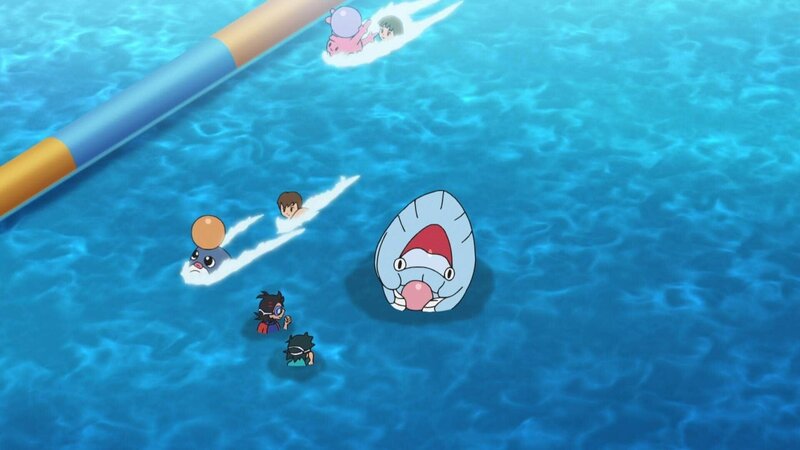 Das Pokémon-Ozeanparkourrennen beginnt! Nach ihrer Ankunft treffen sich unsere Helden mit Kiley, einem Freund von Christin, damit Chloe und Evoli mehr über Kileys Partner Aquana erfahren können. Kiley versichert Chloe, dass Evoli am Rennen teilnehmen kann, auch wenn es nicht vom Typ Wasser ist. Ash tritt bei diesem Rennen mit Pescragon an und Goh wählt Jugong aus, das kurz darauf einen Kampf mit einem aggressiven Aalabyss anfängt.