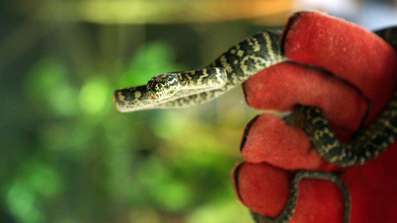 • Jungtier "Ferdinand", ein einjähriger Dschungel-Teppichpython, wird zur Gewichtskontrolle alle vier Wochen gewogen.