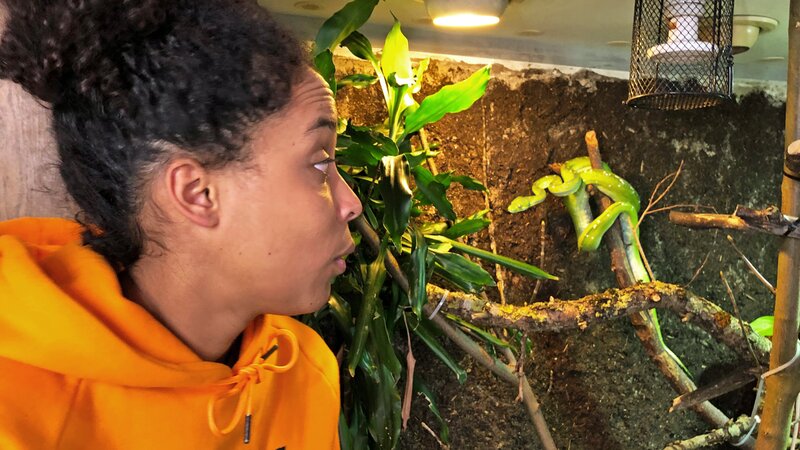 Pia vor dem Terrarium von "Mephisto", einem vier Jahre alten Grünen Baumpython.; Der Grünen Baumpython "Mephisto" wird "geduscht".; Pia beobachtet, wie das Python-Männchen "Mephisto" sein neues Terrarium erkundet.