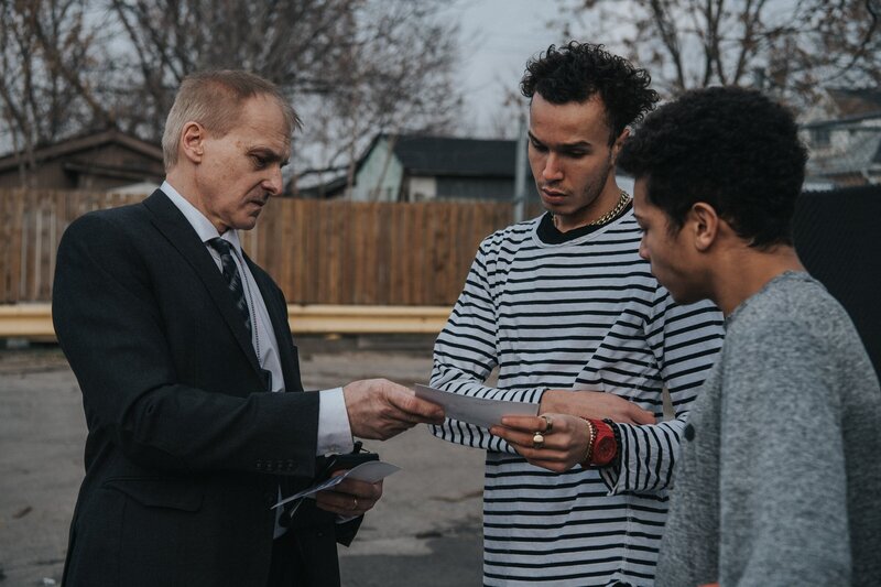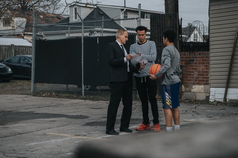 • Detective Vossi (li.) stellt zwei männlichen Jugendlichen, die Basketball spielen, eine Frage über den Angriff auf Richard Bailey