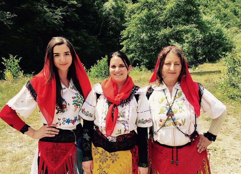 Meine fremde Heimat Kosovo Staffel 1, Episode 1 Karin Dubler mit zwei Tänzerinnen einer kosovarischen Folkloregruppe