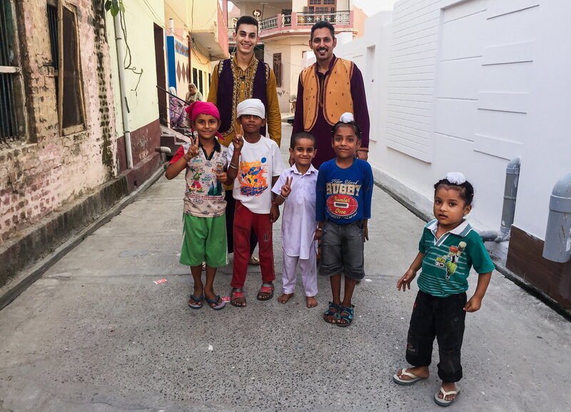 Meine fremde Heimat Staffel 2 Folge 2 - Indien Benjamin und Satbir posieren mit den Kindern des Heimatdorfes