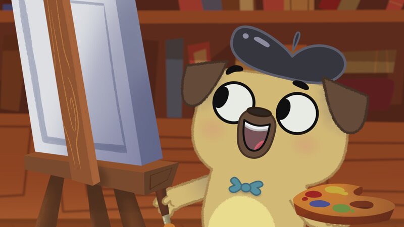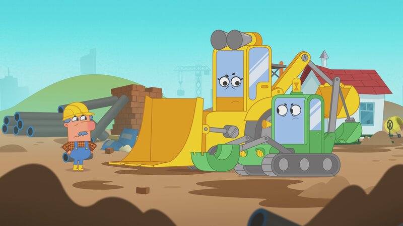 Dog und Puck suchen nach einer Anleitung für eine "Buchtragemaschine". Das Buch, zu dem sie greifen, führt sie auf eine Baustelle. In der Geschichte wetteifern drei Bagger um die Anerkennung des Bauleiters. Während der eine mit Arbeitseifer punktet, protzen die anderen nur mit ihrer Maschinenleistung. Letztlich braucht es vor allem fleißige Hände, um etwas gestemmt zu kriegen. Und die müssen gar nicht groß sein.
