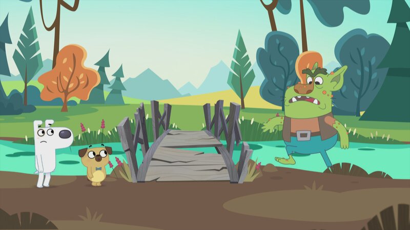 An einer alten und wackeligen Brücke treffen Dog und Puck auf einen grimmigen Troll.