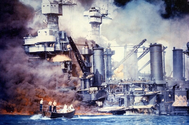 • Ein Motorboot mit Matrosen kurz nach dem japanischen Luftangriff 1941 auf Pearl Harbor – vor der sinkenden 'USS West Virginia' im Hafen.