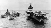 • Das Versorgungsschiff "USS Tappahannock" (M.) betankt den nuklear betriebenen Flugzeugträger "USS Enterprise" (r.) mit Treibstoff für die Trägerflugzeuge.