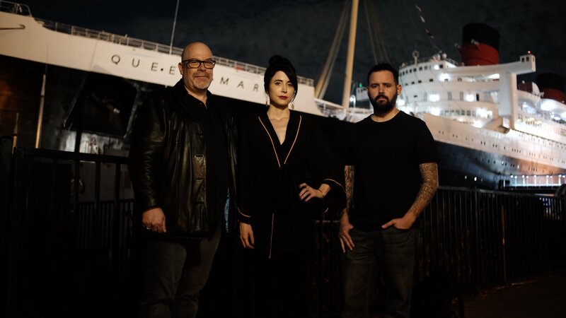 3 Quarters Hero shot of Dave Schrader (left), Cindy Kaza (center) and Shane Pittman (right) during the investigation on the Queen Mary in Long Beach, CA as seen on Travel Channel's The Holzer Files.