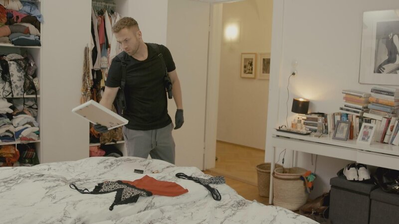Die Farbe rot: Notruf aus dem Badezimmer einer Frau, während der Einbrecher im Schlafzimmer ist. Nach seiner Flucht bleibt seine Signatur: auf dem Bett liegen Dessous, Nagellack und ein roter Lippenstift.