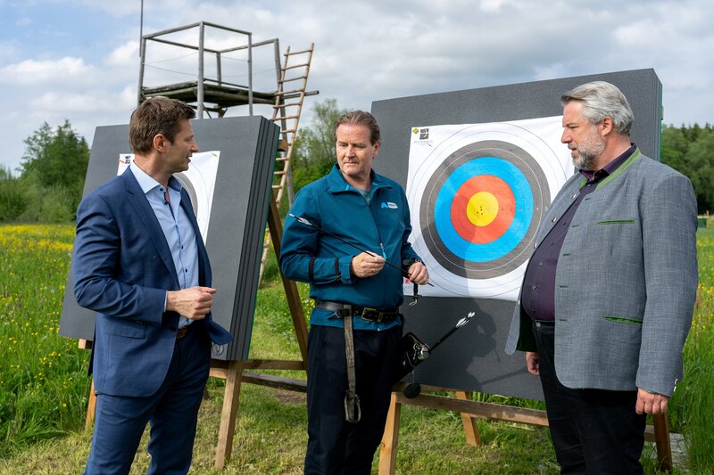 Die Kommissare Stadler (Dieter Fischer, M.) und Hansen (Igor Jefti , r.) befragen die Übungsleiterin des Bogensportclubs Rosenheim, Lisa Pfaff (Tanja Hirner, l.) im Mordfall Arnd Schuster, denn das Opfer wurde mit einem Pfeil getötet.