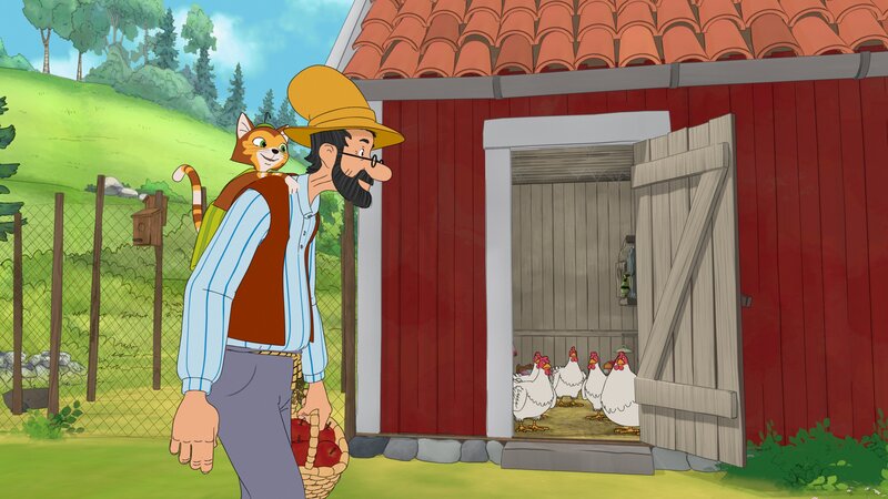 Pettersson und Findus merken, dass die Hühner in ihrem Stall sich verärgert beraten und etwas im Schild führen.