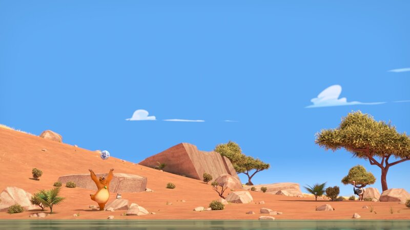 Grizzy will am Teich picknicken, aber die Lemminge stehlen ein Glas Yummy mit einem Wasserball. Der Bär verfrachtet sie in den Wasserball und wirft sie in die Ferne, wo ein Strauß ihn für sein Ei hält und es ausbrüten will.