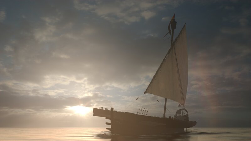 Ship sailing at sunset on a calm sea. Venice in the 16th century was a rich trading city with vast numbers of merchant ships sailing to the far reaches of the Mediterranean. The Gagliana Grossa sank off the coast of Croatia while carrying a rich cargo to Sultan Murad III in Constantinople.