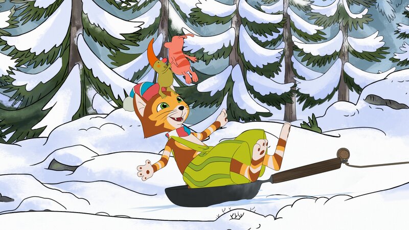 Es hat über Nacht geschneit, und Findus will sofort Schlitten fahren. Allerdings müsste sein Schlitten dafür blitzschnell repariert werden. Aber Pettersson hat gerade keine Zeit. Denn Gustavsson bringt ihm einige aussortierte alte Töpfe und Pfannen vorbei. Da hat Findus eine Idee: Er möchte unbedingt die größte Pfanne behalten, um sie als Ersatzschlitten zu benutzen. Selbst Hund Harpo ist skeptisch: Ob das funktioniert?