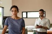 Katrin Hambach (Brigitte Urhausen, l.) nimmt ihrem Mann Stephan (Denis Moschitto, r.) die Ausrede nicht ab, dass er nochmal zum Hafen fahren will um zu kontrollieren, ob er die Gasflasche auf dem Boot zugedreht hat.
