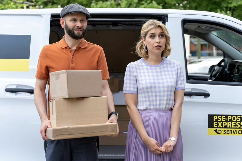 Hannes Winklers (Steffen Wolf, l.) Paketstapel kommt ins Schwanken, als er auf Christin Lange (Sarah Thonig, r.) trifft. Dabei fällt ausgerechnet das Paket für Polizeidirektor Achtziger zu Boden.