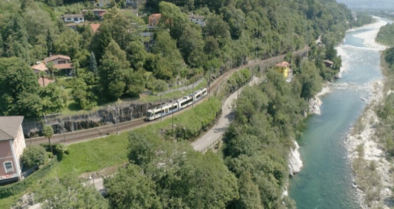 Zurück im Zug, unterwegs Richtung Italien. Unwirkliche Stille und herrliche Lichtspiele bieten sich den Zugreisenden beim künstlich angebauten Stausee bei Palagnedra. Auf dem Weg nach Domodossola ist Camedo der letzte Halt in der Schweiz. Ab der Grenze geht das wilde und schier unüberwindbare Centovalli in ein breiteres und liebliches Valle Vigezzo über.