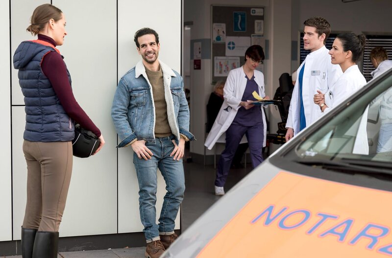 • Alexandro Marquez (Daniele Rizzo, 2.v.l.) ist vom Pferd seiner Freundin Manuela Linden (Carolin Wiedenbröker, l.) gefallen. Trotz der Schmerzen setzt er alles daran vor Ben Ahlbeck (Philipp Danne, 2.v.r.) und Leyla Sherbaz (Sanam Afrashteh, r.), keine Schwäche zu zeigen.