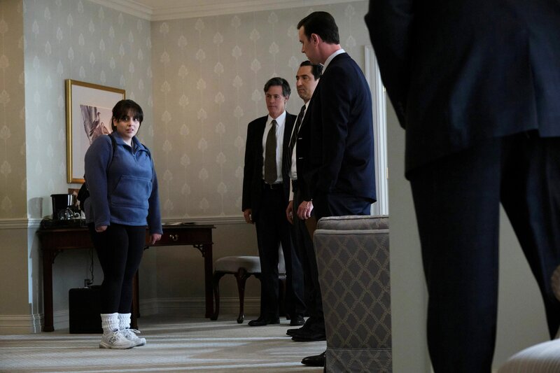 • Impeachment: American Crime Story – Szene mit Beanie Feldstein als Monica Lewinsky, Craig Welzbacher als Agent Irons, David Babich als FBI Agent, Colin Hanks als Mike Emmick.