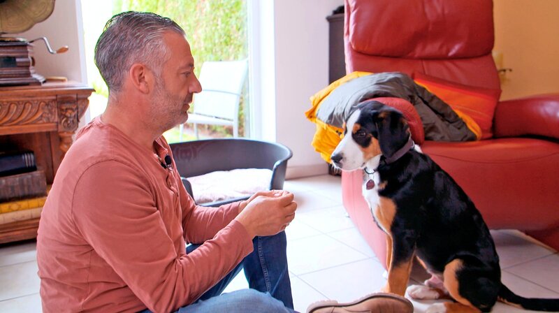 Hundecoach Andreas Ohligschläger zusammen mit Schweizer Sennenwelpe Chester.