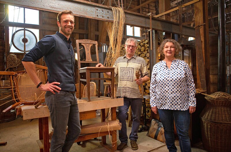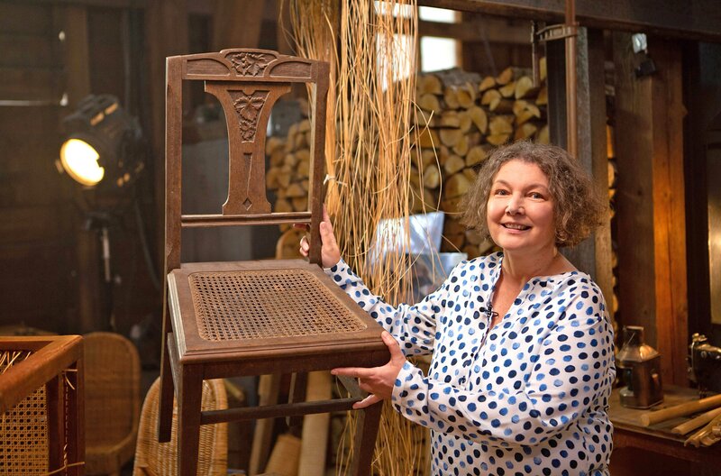 Maria Carl mit Stuhl, dessen Sitzfläche aus Wiener Geflecht ist.