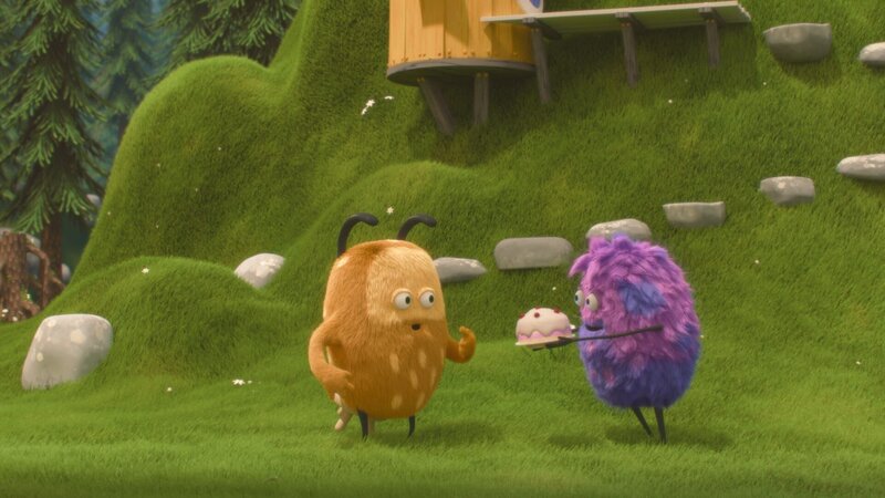 Strit bietet Kiwi einen schönen rosa Kuchen an, Kiwi sieht ihn begeistert an.