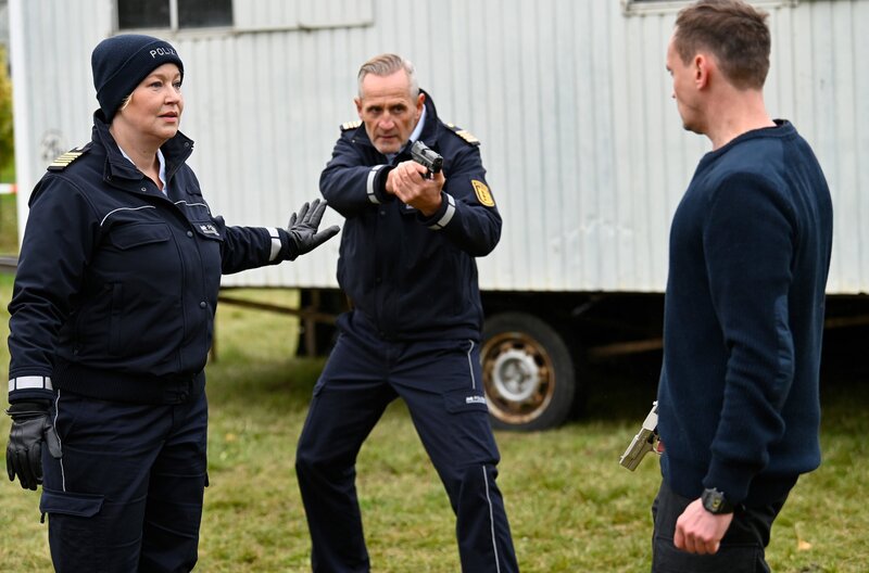 Julia Demmler (Wendy Güntensperger, l.) und Jakob Frings (Max König, r.) versuchen zwei Bankräuber zu stellen.
