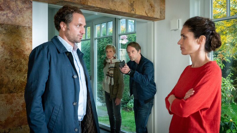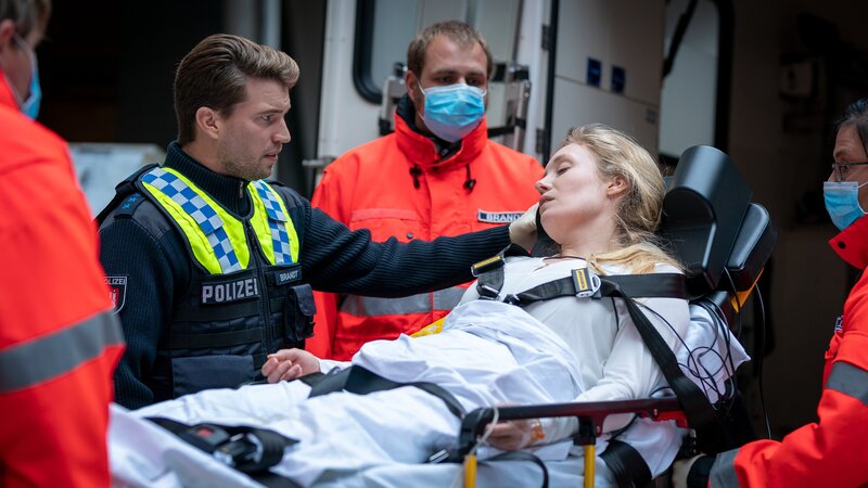 • Nick (Raúl Richter, 2.v.l.) macht sich Sorgen um seine Jugendfreundin Sandra Mertens (Katharina Heyer, 2.v.r.), die bei einem Überfall an ihrem Arbeitsplatz in einer Apotheke verletzt wurde.