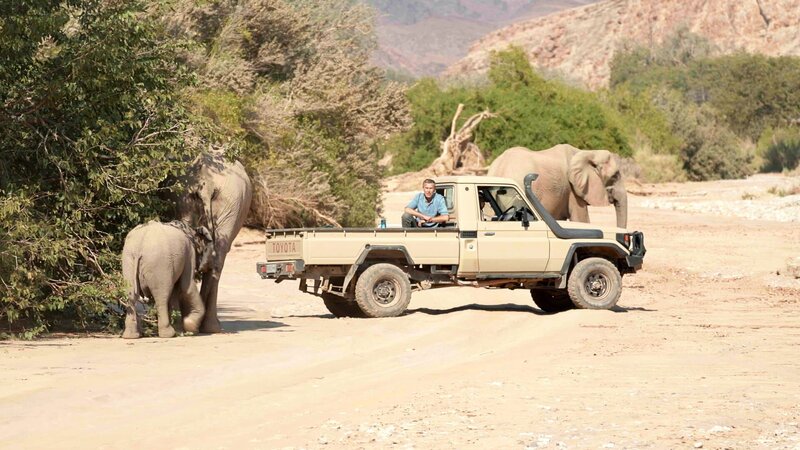 Namibias Wüstenelefanten haben sich an die harschen Bedingungen der Wüste angepasst. Über Generationen hat das auch sichtbare Merkmale hinterlassen; Wüstenelefanten sind schlanker als ihre Artgenossen, haben längere Beine und größere Füße, damit sie weiter und ohne einzusinken durch die sandige Wüste wandern können. Etwa 70 Kilometer legt ein Wüstenelefant täglich auf der Suche nach Futter zurück und damit sieben Mal so viel, wie ein Elefant in einem wasserreichen Gebiet.