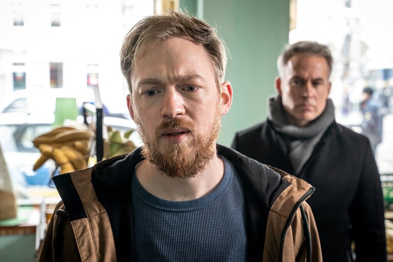 Simon Koschanowsky (Tino Mewes, l.), Mitarbeiter des "Nachbarschaftstreffs", taucht plötzlich am Tatort auf. Jan Maybach (Marco Girnth) kann ihn nicht daran hindern, die Ermittlungsarbeit zu stören.